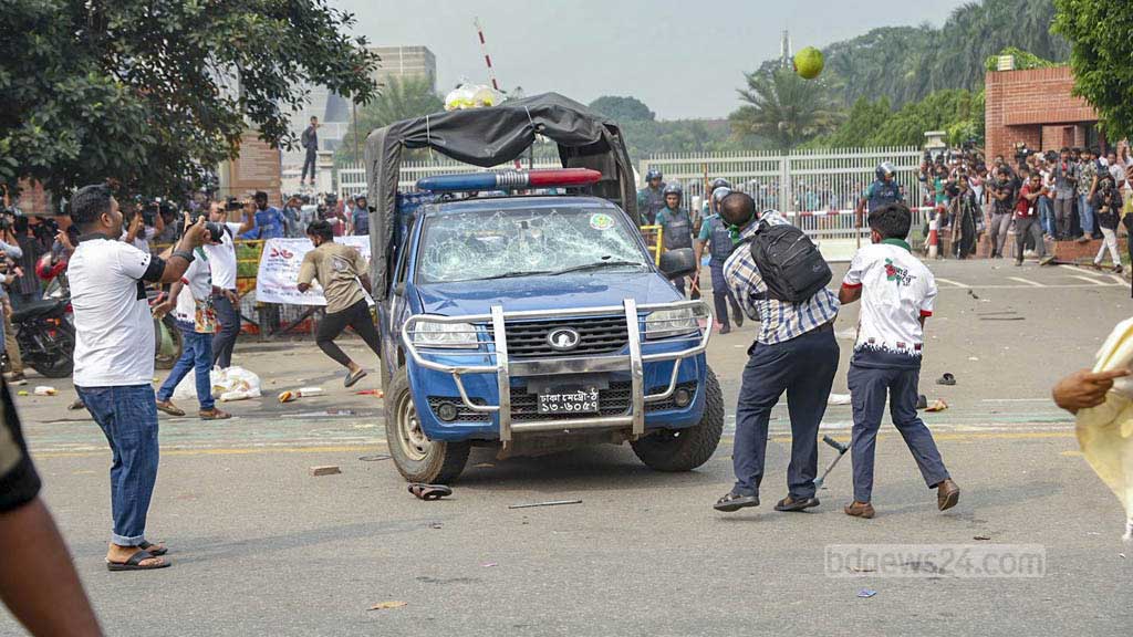 শুক্রবার দুপুরে ওই ঘটনার সময় পুলিশের অন্তত পাঁচটি গাড়ি ভাঙচুর করা হয়। সড়কে পুলিশ ও র্যাবের অস্থায়ী কন্ট্রোলরুমে ভাঙচুর চালিয়ে অগ্নিসংযোগের ঘটনা ঘটে।